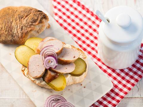 Brötli halbieren, eine Seite mit Margarine, die andere mit Senf bestreichen. Mit Chirat Gurken und Bratwurstscheiben belegen. Zwiebelringe darübergeben.